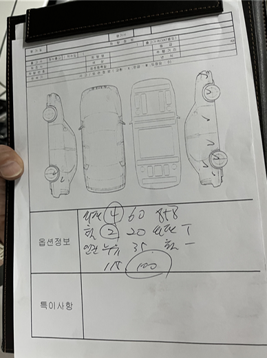 다른 딜러분들과 달리 정비소에 있을 만한 점검용 패널, 두께를 볼 수 있는 장비 등 장비빨이 있으셨다. 비교를 하자면 다른 분들은 경험이 출중하시겠지만 객관적 지표 없이 여기 이래요, 저래요 내가 모르는 말들로 감가 항목을 체크하고 100만원 200만원을 쳐버리시던데, 그래도 뭔가 장비가 있으니 믿을 만 했다. 하지만 네비 안 나온다고 깎으려고 하신건 좀.. 10년된 차라 사실 네비는 이미 사용불가지 않나요!!!